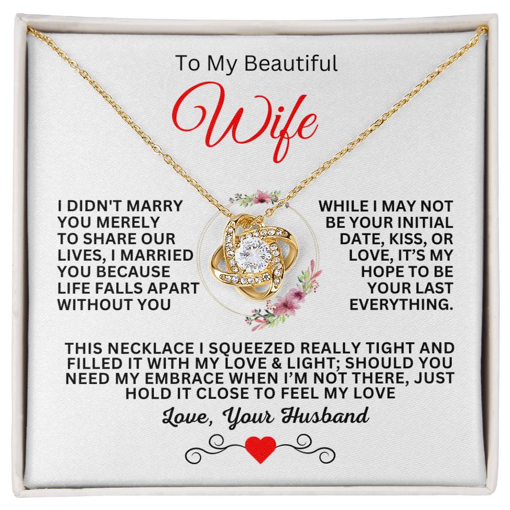 I DIDN'T MARRY YOU SO THAT I COULD LIVE WITH YOU. I MARRIED YOU BECAUSE I CAN'T LIVE WITHOUT YOU. I MAY NOT BE YOUR FIRT DATE, KISS, OR FIRST LOVE, BUT JUST WANT TO BE YOUR LAST EVERYTHING. I SQUEEZED THIS NECKLACE REALLY TIGHT AND FILLED IT WITH MY LOVE & LIGHT. IF EVER I'M NOT HERE & YOU NEED A HUG, JUST HOLD IT CLOSE TO FEEL MY LOVE.
